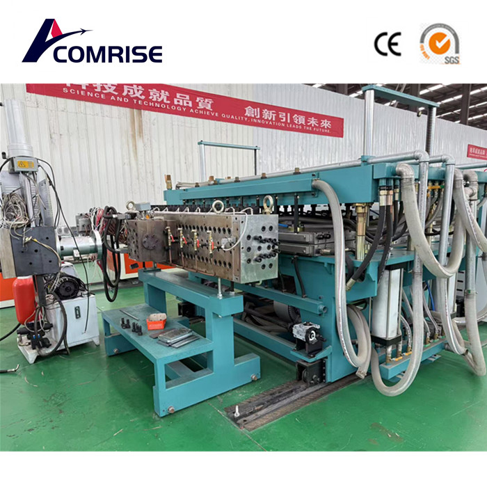 A máquina da placa Hollow PP consiste em uma extrusora de parafuso único, trocador de tela hidráulica, molde, máquina de modelagem, máquina de transporte primário, forno de recozimento, caixa de resfriamento, máquina de transmissão secundária, máquina de corte cruzado e transportador.